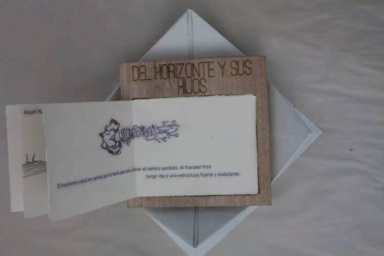 “El horizonte y sus hijos” es un libro que retoma los aprendizajes de mi estancia en Colombia y las intervenciones espaciales ahí realizadas para crear una nueva reflexión desde lo gráfico y lo textual. Los textos que son incluidos en el libro tienen que ver con una nueva génesis del mundo pensada desde el humano como caminante y cuestionando el papel que ha tenido la mujer en ello. El brote y el humano como seres vivientes que se rebelan al horizonte, le rompen, le caminan, y le reconfiguran.
